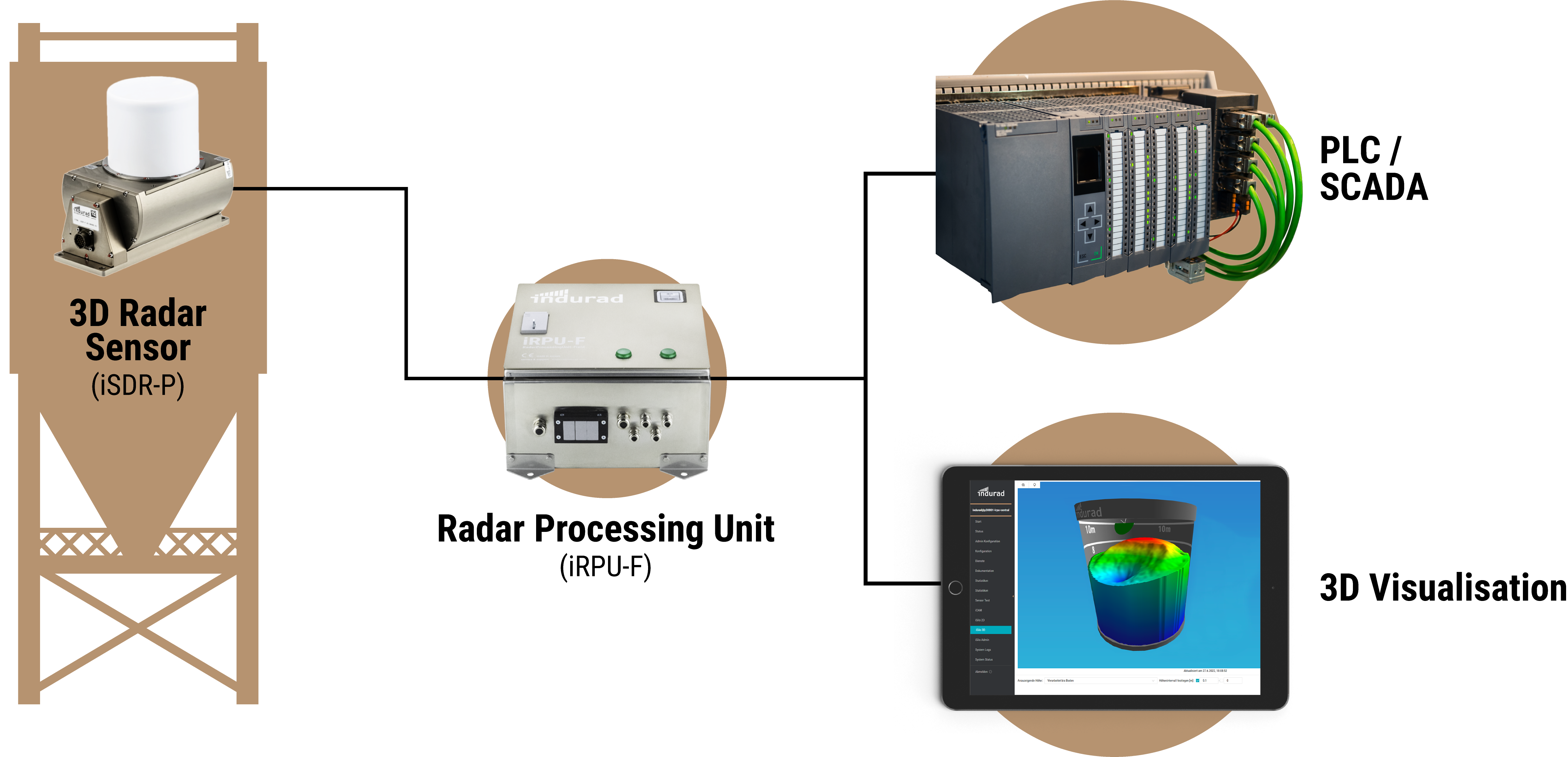 iSilo 3D starts with robust radar sensors that scan the pile continuously and send the data over Ethernet to our powerful processing unit. The processing unit analyzes the data and sends all outputs directly to your PLC / SCADA systems over the interface of your choice. You can also use a web browser to access a user-friendly interface that provides a real-time, 3D visualization of the material as well as data storage and replay.